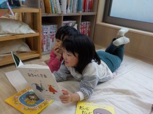 少しずつひらがなが読めるようになってきた子どもたちは、一人でじっくりと絵本の世界に没頭したり、子ども同士で物語を共有しながら一緒に読んだりする姿もありました。絵本コーナーでは、マットを敷いて子どもたちがリラックスして絵本を読める環境作りをしています。