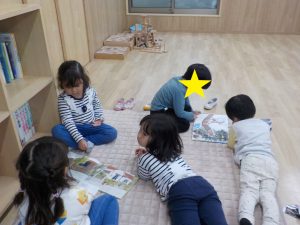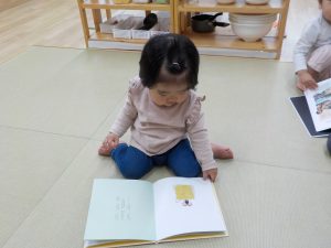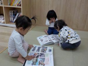 絵本や図鑑を一緒に共有しているうちに、自然と子ども同士の会話も増え、楽しむ姿が見られていますよ。今後も絵本に親しむ時間を大切にしていきたいと思います!