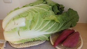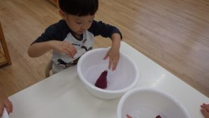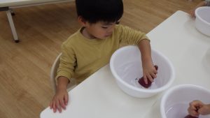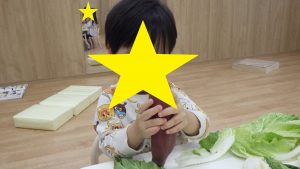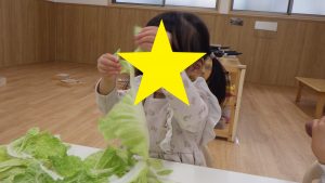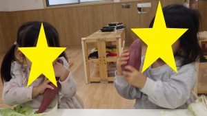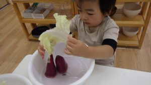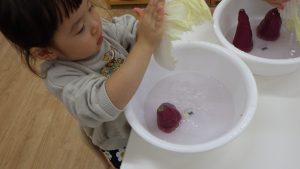 さつまいもに触れていると中身が気になったようで「ちょっきんしたい」と伝えてくれました。調理の先生に来てもらい、実際に目の前で切ってもらいました。保育者と一緒に「ちょっきんちょっきん」と言いながら切る音を楽しんでいました。切った後は「お野菜洗わないの?」と子どもたちから提案がありました。「ここ汚れてる」「ゴシゴシ」「綺麗になったかなぁ」と保育者や他のお友達とやり取りをしながらさつまいもを洗う姿が見られました。さつまいもを洗っていると『はっ!』と思い出したように「白菜も洗わないと!」と白菜も洗っていましたよ。