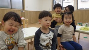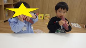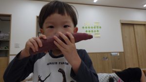 その日がおやつが大学芋だったのでさつまいもが使われていました。そのことに気が付き「お芋美味しかったねー」と食べた事を思い出し保育者に伝えてくれる姿がありました。