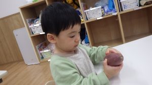 さつまいもをじっくりと観察をしてみたり、匂いを嗅いでみたりと子どもたちから興味を持ち沢山触れていました。