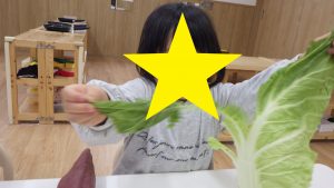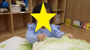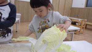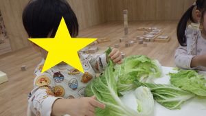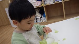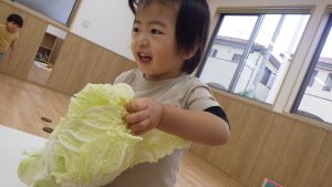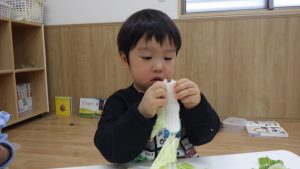 各クラスでさつまいもと白菜に触れてみました。白菜に触れていると「ちぎちぎしたい」と保育者に伝え、自分で白菜を取る姿が見られました。。白い部分に沿って大きくちぎる子もいれば細かくちぎる子どももいました。大きい白菜を自分で持ってみたいと感じたのか白菜に手を伸ばし持ち上げる姿もありました。「おもたいねぇ」「〇〇力持ち!」と言いながら白菜の重さを感じています。