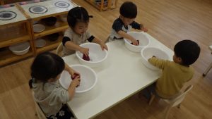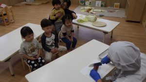 家庭や、園で料理する姿を目にしたり、実際に自分でした調理経験から洗う・切るということが料理の中で必要であると感じていますね。その様子はおままごとの中でも再現する姿が見られています。今後も実際に触れることで食への興味に繋がっていけるよう環境づくりをしていきたいと思います。