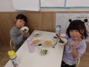保育園では前日の11月14日(金)に七五三のお祝いとして、給食に【鮭ちらし、和風しらすサラダ、すまし汁】が出ました。