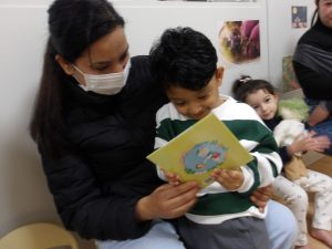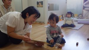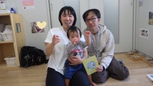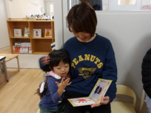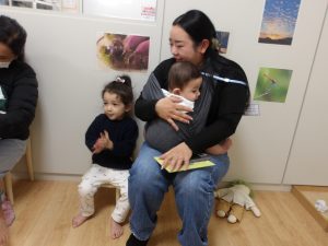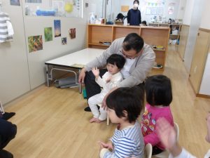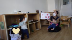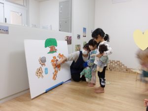 「どんないろがすき」のスケッチブックシアターをしました。誕生児のお友だちが好きな曲です。うたに合わせて体を揺らしたり、手をたたいたり体を動かすと、近くで同じ動作をするお友だちの姿が‥。その姿を見て更に楽しさを感じているようでした。