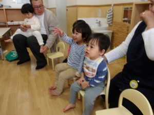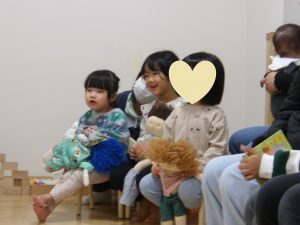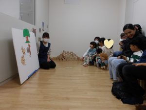 「どうぞのいす」のパネルシアターをしました。シアターが始まりうさぎがトンカチを持った場面が出てくると、「どうぞのいすじゃない?」と言葉にしたり「からっぽにしてしまっては、あとのひとにおきのどく」など知っているセリフやお気に入りのフレーズを聞いて笑みを浮かべ、お話の世界を楽しんでいました。