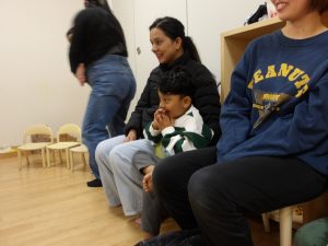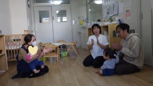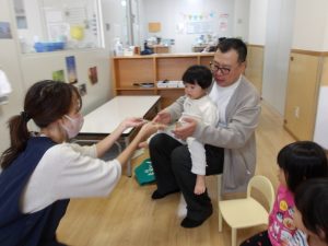 11月は0歳児、1歳児、2歳児全てのクラスで誕生会が行われました。お祝いをする子どもたち、保護者の方々、保育者たちの声で活気に満ち、園全体が賑やかな雰囲気になりました。「おたんじょうび、おめでとう!」の贈る言葉や、「ハッピーバースディトゥーユー♪」の歌の贈り物では、子どもたちは拍手をしたり、歌に合わせて手拍子をしたり、言葉で思いを伝える等、あらゆる表現方法で自己をのびのびと発揮していました。0歳児クラスでは誕生会を通して人と人とのふれあいを感じ楽しむことができるように、1歳児クラスでは自分の成長をみんなにお祝いされる喜び、他児と喜びを分かち合う体験を実感することができるように、2歳児クラスでは更に他児との関わりを通して祝う楽しさや思いやりを育み、言葉や表現の発達を促す体験となるように考えています。日々の保育の中で愛着形成構築を大切にした関わりを保育者が丁寧に行っていくことで、いつもと違う環境の誕生会でも子どもたちひとりひとりが安心して過ごすことができるようになります。