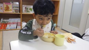 「これなぁに?」「やさいのうた」のスケッチブックシアターをしました。子ども達は歌が大好きなので「もう1回!」と何度もリクエストをしていました。保育者がその思いに何度も応じたことで、満足感を感じみんなでお気に入りの歌を口ずさむ楽しい会になりました。