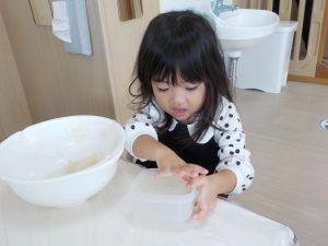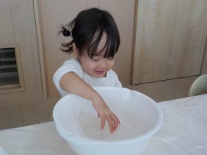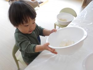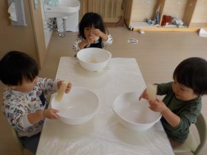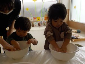 様々な素材に触れることで五感を使って発見ができるように感触遊びを取り入れています。