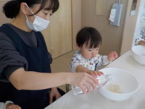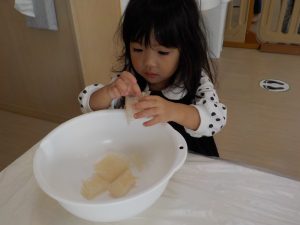 お月見団子作りではお団子の粉に触れ、今回は「寒天」を使用しました。