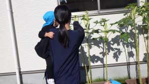 園庭にでると窓から見えた芋虫を探し、見つけると近くで見るために「抱っこで見たい」と保育者に伝え芋虫の観察をしていました。