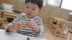 取ったオクラを子どもたちの前で切って確認してみました。虫の話やどこまで穴が開いているかの話を保育者としていた子どもたちは保育者が切ったオクラを自分の力で開けて中身を見ようと試行錯誤していました。中身をみて虫がいないことを確認すると「虫いなかったねー」やオクラの種を発見すると「白い種が入っていたね~」と気付きを言葉で伝える姿があります。