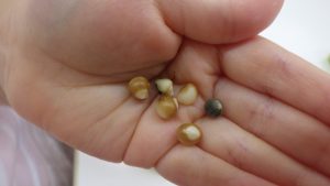茶色になったオクラは触って観察をする際に音が鳴る事に気が付くとオクラを振って確認する姿がありました。保育者が切ろうとすると先ほど白い種を見た子どもたち「白い種が出てくるかなぁ」と期待する姿がありました。中の種を出して見せてみると「あれ??」とさっきの種との色の違いに気付き不思議そうな顔で保育者を見つめて違いを伝えてくれました。白い種と黒い種を並べて見比べ「色違いのオクラだね」と表現していました。保育者が黒くなった種を植えるとまたオクラが育つことを伝えると「へーそうなんだ!」と種を観察していました。