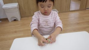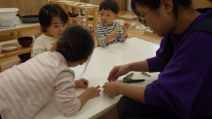 取ったオクラを子どもたちの前で切って確認してみました。虫の話やどこまで穴が開いているかの話を保育者としていた子どもたちは保育者が切ったオクラを自分の力で開けて中身を見ようと試行錯誤していました。中身をみて虫がいないことを確認すると「虫いなかったねー」やオクラの種を発見すると「白い種が入っていたね~」と気付きを言葉で伝える姿があります。