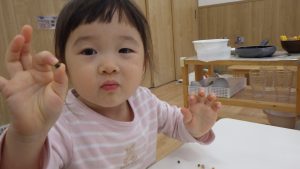 茶色になったオクラは触って観察をする際に音が鳴る事に気が付くとオクラを振って確認する姿がありました。保育者が切ろうとすると先ほど白い種を見た子どもたち「白い種が出てくるかなぁ」と期待する姿がありました。中の種を出して見せてみると「あれ??」とさっきの種との色の違いに気付き不思議そうな顔で保育者を見つめて違いを伝えてくれました。白い種と黒い種を並べて見比べ「色違いのオクラだね」と表現していました。保育者が黒くなった種を植えるとまたオクラが育つことを伝えると「へーそうなんだ!」と種を観察していました。