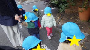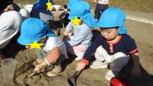 暖かく天気の良い日には戸外に行き自然物に触れる活動も取り入れています。落ち葉や木の実を探す中で砂に触れ、感触を楽しむ様子が見られるようになってきたので、砂場遊びを取り入れました。