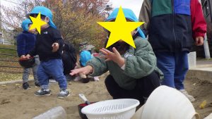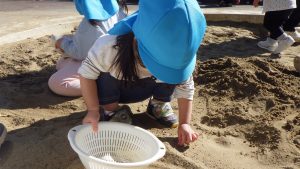 ザルを使うと砂が落ちていき小石が沢山出てきました。砂場の中に石にがある事に気付いたようで、石を1つずつ探してつまんでいました。気付きから次の遊び、研究へ繋げていく様子も見られます。