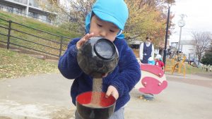 玩具はおままごとコーナーと同じ食器を揃えています。スプーンやお玉で掬い、お椀に入れ「ご飯だよ」「食べてみる?」と食べる真似をして模倣遊びを楽しんでいます。イチョウの葉を見つけると、作ったご飯に乗せ「ケーキの飾り」「トッピング」と表現したりする様子もありました。お椀いっぱいに砂を入れ、逆さにすると形が出来ることを保育者とのの遊び中で気づくと、自ら入れひっくり返しケーキ作りも楽しんでいます。ケーキが出来ると誕生日の歌が始まり、想像しながら遊んでいるのが分かります。