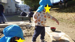 玩具はおままごとコーナーと同じ食器を揃えています。スプーンやお玉で掬い、お椀に入れ「ご飯だよ」「食べてみる?」と食べる真似をして模倣遊びを楽しんでいます。イチョウの葉を見つけると、作ったご飯に乗せ「ケーキの飾り」「トッピング」と表現したりする様子もありました。お椀いっぱいに砂を入れ、逆さにすると形が出来ることを保育者とのの遊び中で気づくと、自ら入れひっくり返しケーキ作りも楽しんでいます。ケーキが出来ると誕生日の歌が始まり、想像しながら遊んでいるのが分かります。