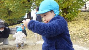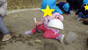 暖かく天気の良い日には戸外に行き自然物に触れる活動も取り入れています。落ち葉や木の実を探す中で砂に触れ、感触を楽しむ様子が見られるようになってきたので、砂場遊びを取り入れました。