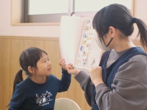 発表当日は、いつもと違う雰囲気で緊張もあり、恥ずかしさからはにかんだり、保育者と目を合わせたりする姿もありましたが、保護者の方の温かな見守りと保育者の問いかけに、次第に子どもたちの方から一人一人スクラップブックに込めた思いをみんなに伝えてみようとする姿が見られました。