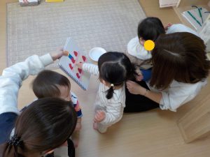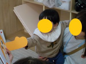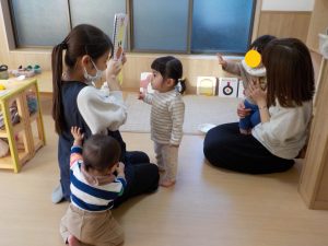 顔を隠した動物が出てくると興味津々で見ていました。「ピンク色だね」「耳が三角だね、誰かな?」等やりとりをしながら「いないいないばあ」をすると、ぶたやねこ、きりん等の動物が出てきました。一緒に「ばあ」と言ったり、ニコニコで体を揺らしていました。