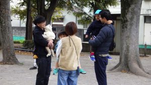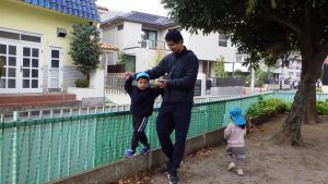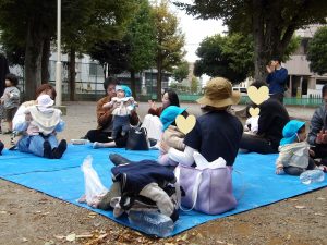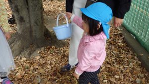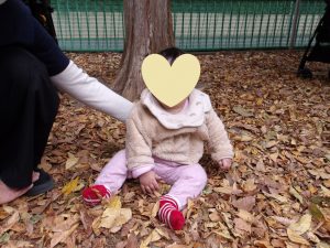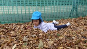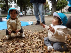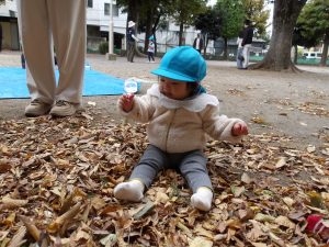 雨で開催が延期になり当日はひんやりと寒さを感じました。いつも行くお散歩先のひとつ「郷前公園」。公園は枯れ葉の落ち葉でいっぱいになっていました。枯れ葉・落ち葉遊びは秋ならではの自然素材を使った遊びです。音・感触・色・形を楽しむことができる遊びで子どもたちの五感を刺激します。
