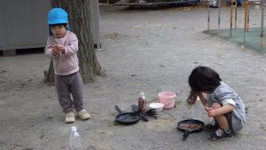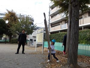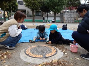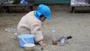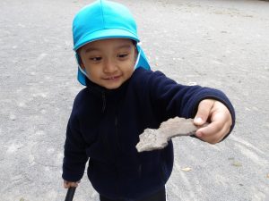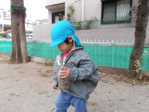 子ども達は他にどんぐりや木の皮、砂、石などの様々な自然物に触れ、大好きな大人に見守られながら自分で道具を選び、試行錯誤や観察・実験・研究を満足いくまで楽しみました。子どもの遊ぶ姿から昨年とは違う成長や発達を感じます。「うわーたくさん集めたね!」「この形、不思議だね。」「どこにあったの?どうやったのかな?」子どもの感じたことに共感・代弁する関わりや自分の発見を伝えようとする思いを受け止め言葉のやりとりを楽しむことも、実は0、1、2歳という乳幼時期の「遊び」そのものであり、子どもの育ちにとても重要になのです。