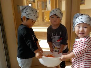 これからも、食材への興味が自然と育っていくよう、日々の保育の中で食材に触れる機会をつくっていきたいと思います。