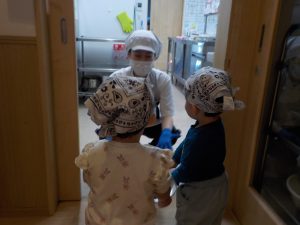 調理の先生に野菜を手渡すと、「ありがとう」「おいしく作るね」と声をかけてもらい、子どもたちも嬉しそうな表情をしていました。