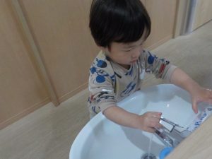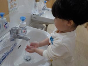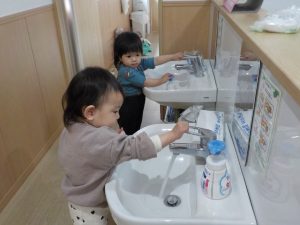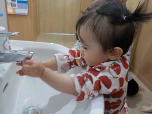 食事前や排泄後、戸外活動の際に手洗いを一緒に行うことで子どもたちも「あわあわ」「手洗う」と習慣になっています。