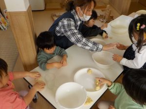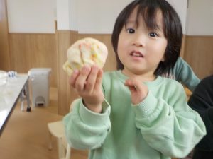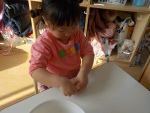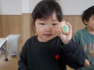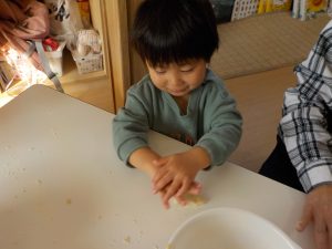 小麦粉で粘土が作れることを伝えると、皆興味津々で「やりたい!!」とわくわくしていました。うどん作りでも触ったことがあったので小麦粉のサラサラとした気持ちいい感触に皆ニコニコでした。そこにサラダ油と水を足してみると、ペトペトと手にくっついて取れなくなり、その変化に驚いたようで「べとべと…」「手洗いたい…」と話す子もいました。