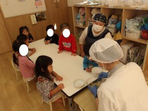 最近では、給食を食べている時に「どうやって作ってるの?」などと疑問をもっているそら組の子ども達。食材がどうやって調理されているのか、どんな姿から作られるのか、子ども達が興味を示す姿も多く見られましたので、調理の先生に子ども達の前で、盛り付けや味付けをしてもらうことにしました。その時の様子をお伝えします。