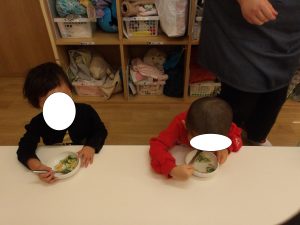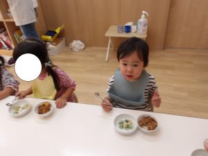 子ども同士で『美味しいね』とやり取りする姿や、保育者に『食べたよ』と伝えてくれる姿も多く見られました。食事の場面では「楽しく食べる」ということがとても大切です!お友達と一緒に、楽しくやり取りをしながら食事をする場面は微笑ましく、いい成長だなーととても嬉しくなりました。