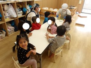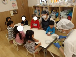 この日の副菜は「温野菜サラダ」です。野菜はさつまいも・人参・ブロッコリー。味付けはマヨネーズです。味付けをしてもらっている最中には『何が入っているの?』『何を混ぜているの?』と興味津々で観察していました。