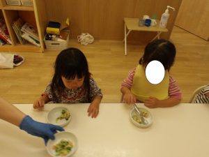 目の前で混ぜる・盛り付ける事で興味や関心を示し、普段苦手なお野菜でも一口でも食べてみようと、自ら進んで食べる姿も多く見られましたよ。