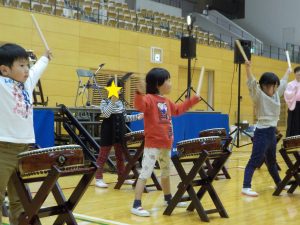 5歳児クラスの子どもたちは、講演終了後に和太鼓の演奏体験をしています。