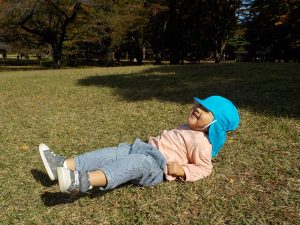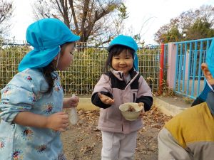以前までは自然物に触れた時の感触を一人一人で楽しんでいましたが、徐々に「葉っぱを大きな山にしてみたら?一緒に集めてみよう!」と一緒に集めジャンプしたり寝てみる子どもたち。「ふかふかだね。」と共有したり、上着の素材の違いから葉がくっつく服とつかない服があることに気付き「○○ちゃんのは葉っぱがついてないね、なんで?」と疑問を伝えるようになりました。子どもたちの疑問に寄り添い、一緒に考えたり試して、新たな発見に繋がるように今後も関わっていきたいと思います。