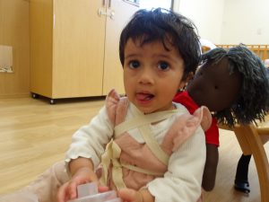 抱き人形の赤ちゃんに興味を示して触れてみたり、遊びに取り入れ一緒に過ごす姿が増えてきした。
