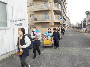 園長の「白子川が氾濫する恐れがある為避難します」の呼びかけから各クラス担任が子どもたちに避難することを伝えると、子どもたちも話に耳を傾け、保育者と一緒に避難準備をしました。