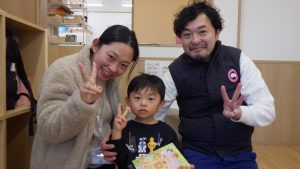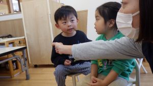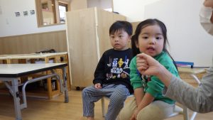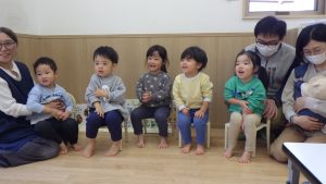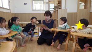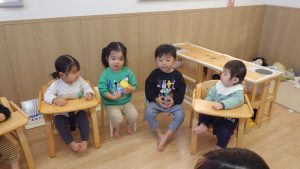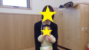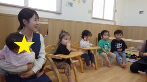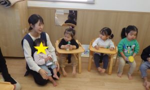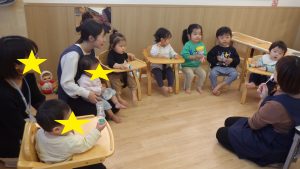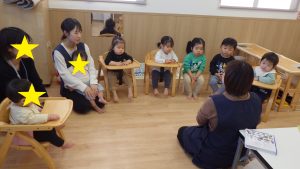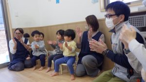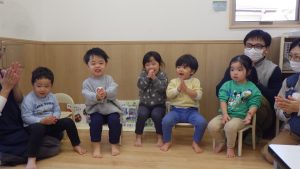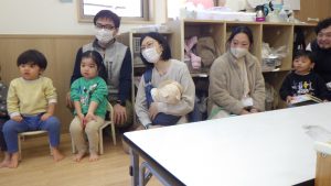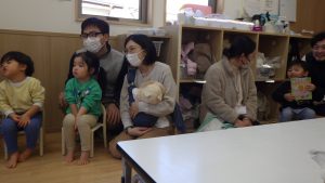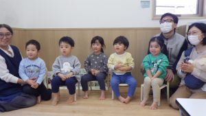 保護者の方にも来ていただき、全員揃うと誕生月の子に前に出て座ってもらいました。
