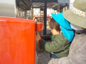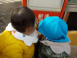 ぺたぺたと触ってみたり、じ~っと観察してみたり…はがきが中に入るのを不思議そうに