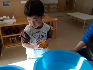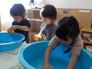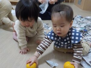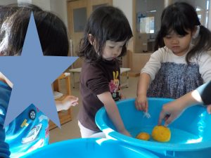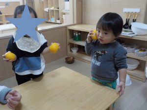 ほし組では両手に持ってとんとんと合わせてみたり、ころころと転がしたりと「これは何かな?」と研究する様子が見られました。