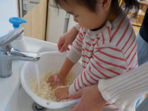 また、乳児クラスの子ども達ももち米を研いだり炊いたりして日本の伝統行事に触れることが出来ました。