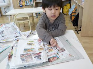最初は、自分の気になるものを見つけて切ってコレクションのように貼っていた子どもたち。
