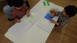 糊を出してみると、初めは指先で触れてみたり、慣れてくると段々と手で握ってみたりとまずは糊の感触を自分の手で確認する姿がありました。保育者が一緒に糊に触れる中で保育者の模倣をしながら自由画帳や折り紙に糊を「ぬりぬり」と言いながら広げてつける姿がありました。