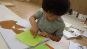 折り紙を破いたり、糊で貼ったりを楽しむ中で子どもの中でイメージが広がっていき貼った物を「〇〇みたい!」と教えてくれることも増えました。閉じてしまうと糊でくっついてしまうことを伝え乾かしていると乾かしているページを見て「ままとぱぱにもみせる!」と話し、保護者の方にも共有したい気持ちが伝わってきますね。
