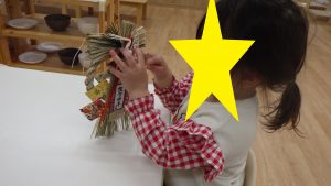 「これなに?」と飾り1つひとつの名前を聞き、「鏡餅だよ」「しめ縄飾りだよ」と保育者が答えると子ども達も言葉を真似し繰り返しながら確認していました。