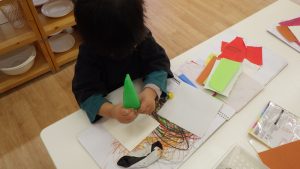 折り紙を破いたり、糊で貼ったりを楽しむ中で子どもの中でイメージが広がっていき貼った物を「〇〇みたい!」と教えてくれることも増えました。閉じてしまうと糊でくっついてしまうことを伝え乾かしていると乾かしているページを見て「ままとぱぱにもみせる!」と話し、保護者の方にも共有したい気持ちが伝わってきますね。