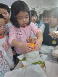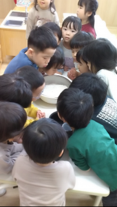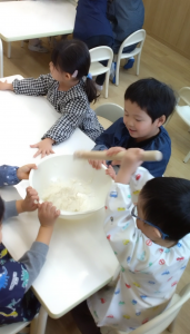 お正月を前に、3歳児クラスで日本の伝統行事である鏡もちを作りました。